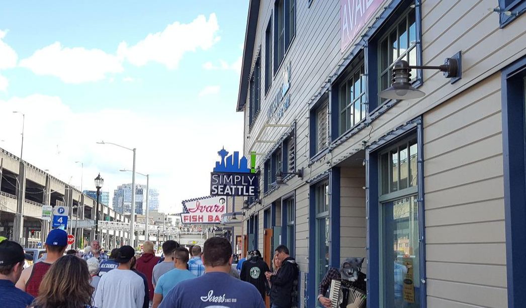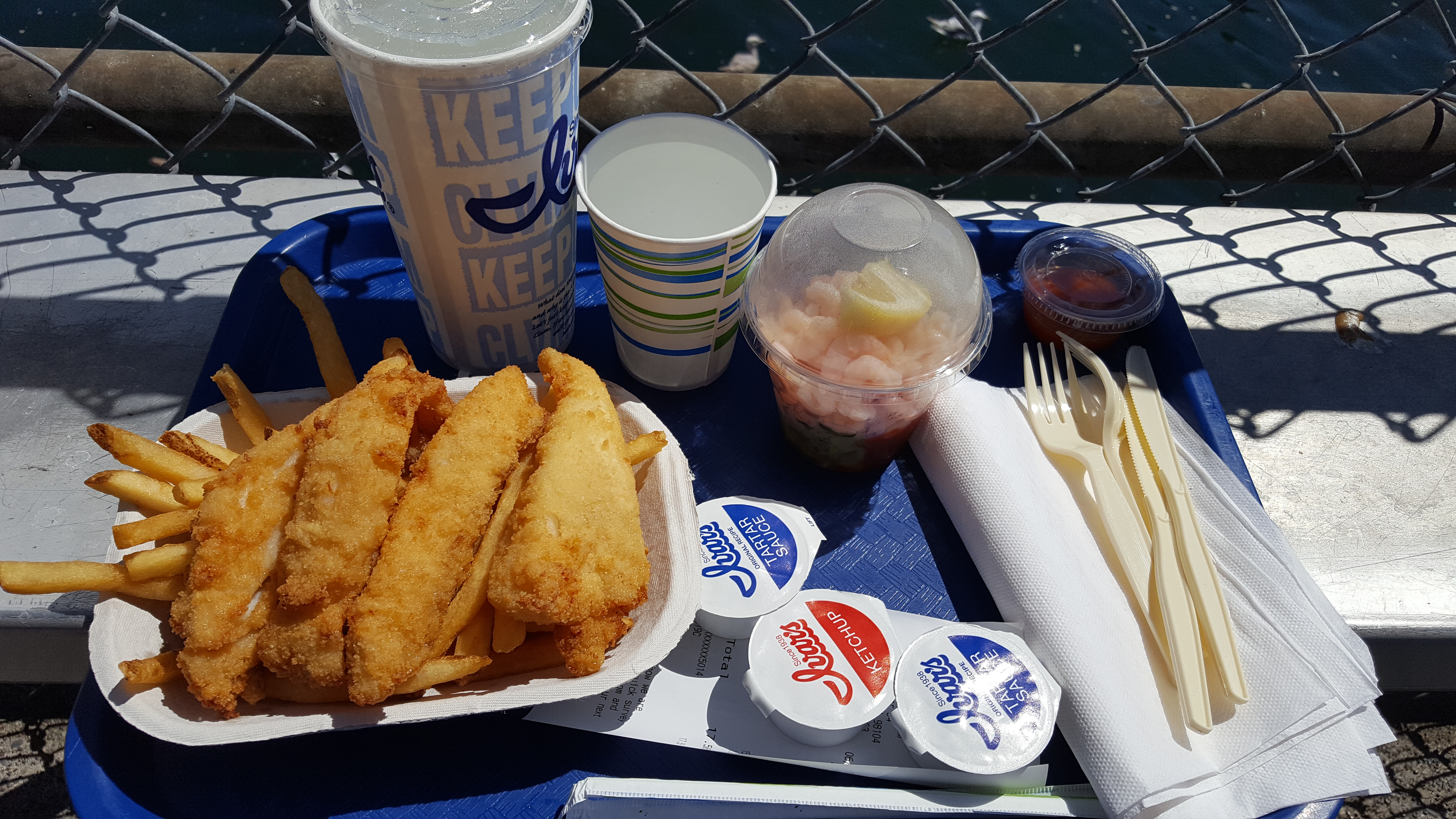 이렇게 바닷가를 걸으며 이국적인 풍경을 구경도 하고 사진도 찍다가 점심을 먹으려고 시애틀 맛집이라는 크랩팟에 가려고 했는데, 맛집 답게 줄이 너무 밀려있었다. 다른걸 뭘 먹을까 하다가 바닷가니까 피쉬 앤 칩스를 먹기로 했다. 크랩팟에서 좀 걸어가니 이바스Ivar's Acres of Clams라는 식당이 있었는데, 바다를 보면서 먹을 수도 있어서 좋아보였다. 피쉬 앤 칩스와 칵테일 새우를 주문해서 야외 좌석에 앉았다.