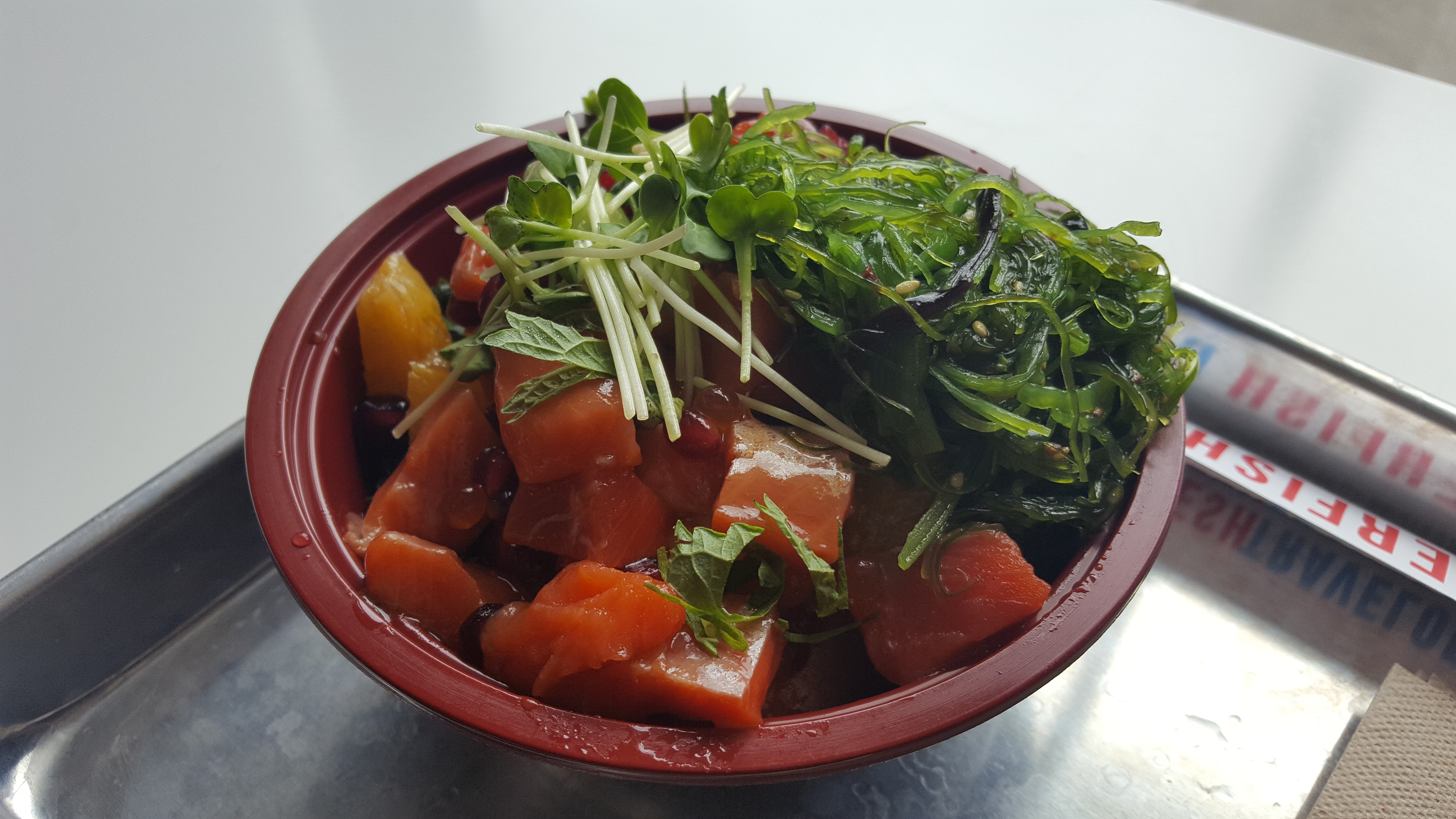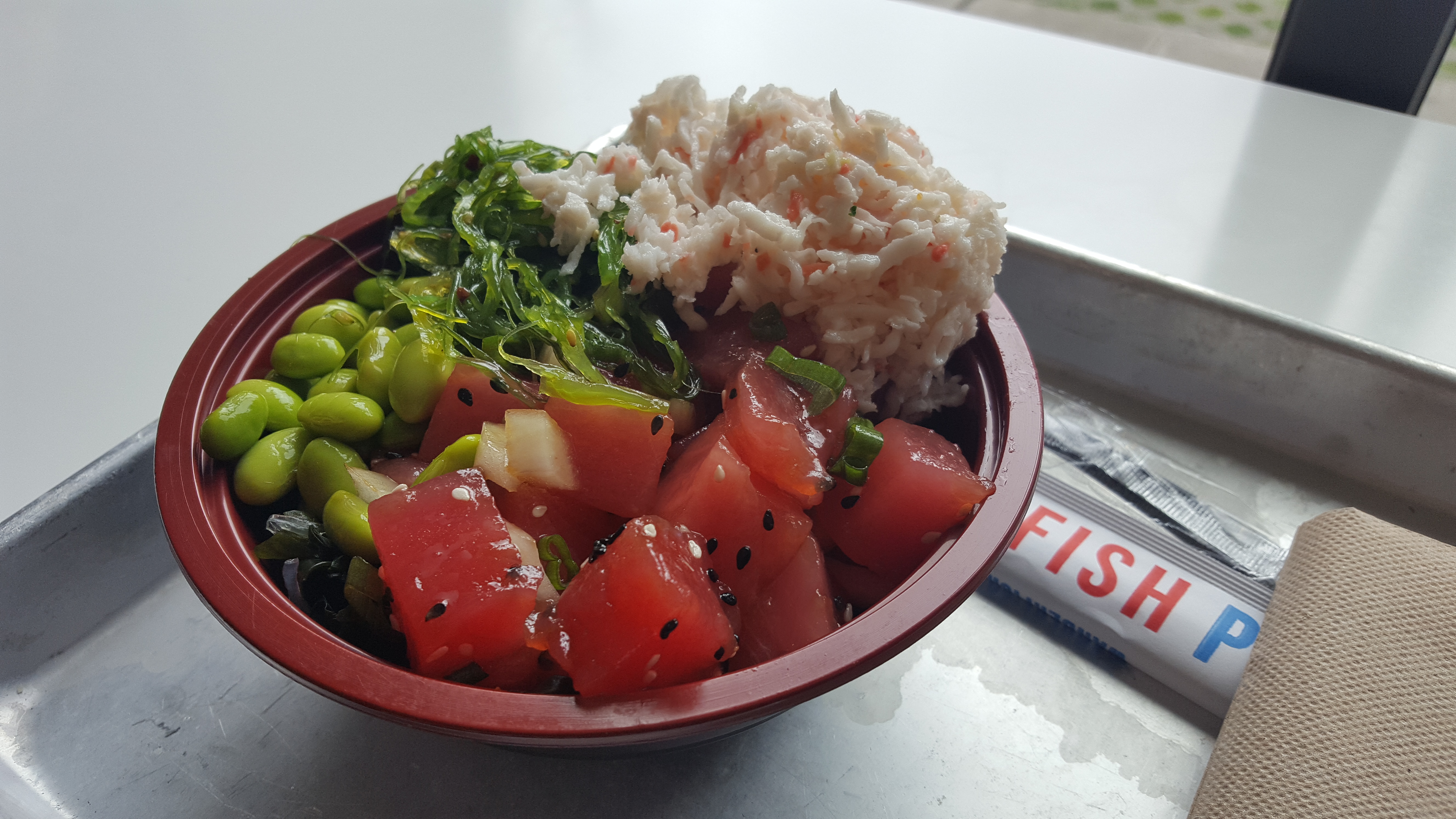 포케는 하와이 음식인데 한국의 회덮밥이나 일본의 치라시동이랑 비슷한 모양의 음식이다. 가장 밑에 탄수화물을 깔고 (흰 쌀밥, 현미, 퀴노아 등 중에 선택 가능) 네모로 잘린 참치나 연어 회를 올리고 (채식주의자는 두부..) 다른 채소들을 올려 소스를 뿌려먹는 음식이다. 회덮밥은 매운 소스를 뿌리지만 보통 마요네즈 베이스의 소스나 달달한 소스류를 뿌리는 듯 하다. 소스를 잘 못 고르면 느끼하다.