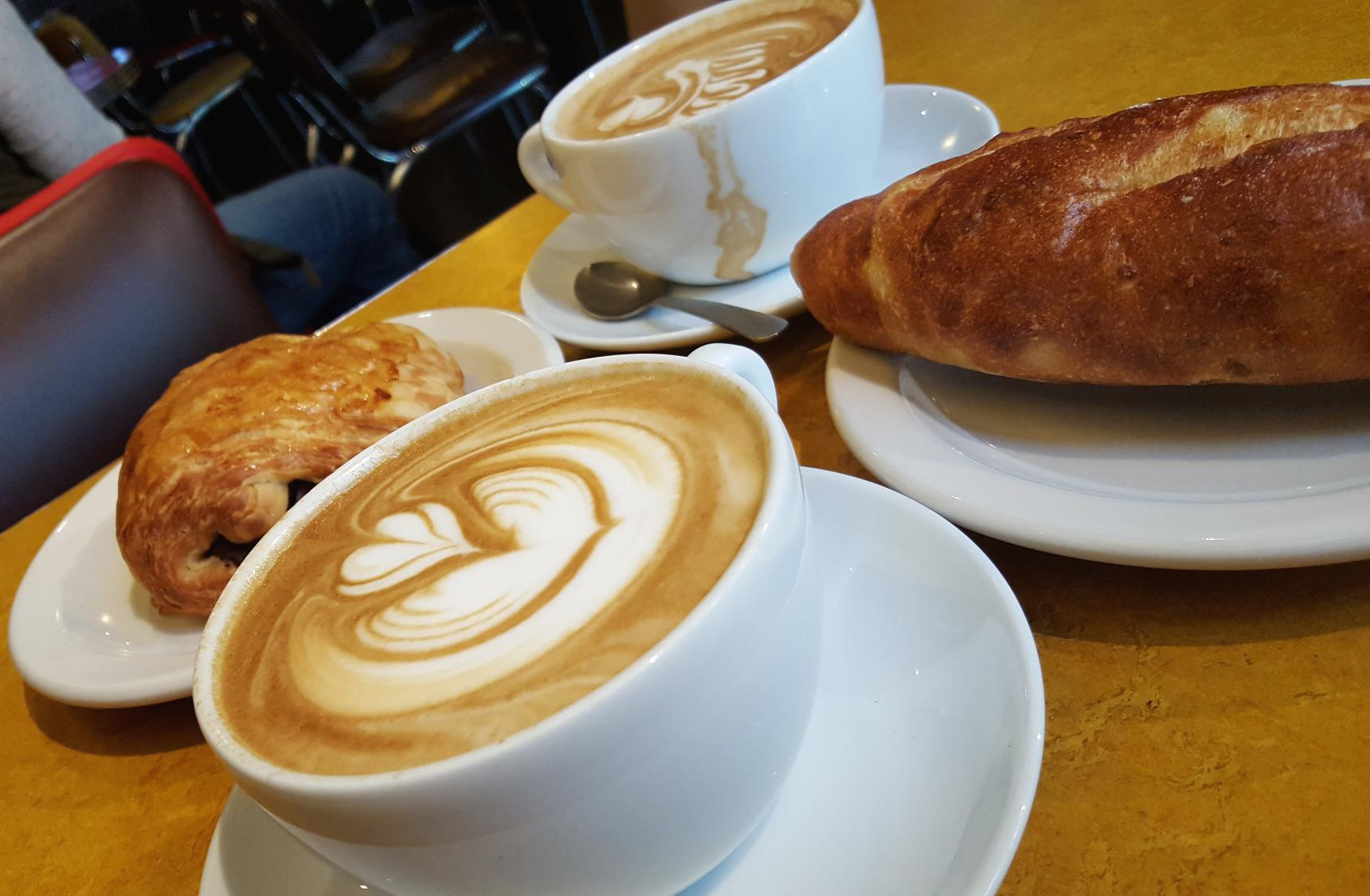 벽에 포스터와 그림들도 많이 붙어있었다. 커피 종류도 많고 빵도 종류가 많아서, 메뉴를 고를 때 늘 고민이 많은 나는 꽤나 고민을 했지만 결국은 라테와 감자빵을 골랐다. 언니는 라테와 뺑오쇼콜라Pain au chocolat를 골랐다!