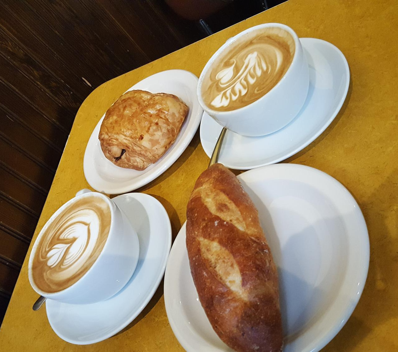 두 잔의 라테와 감자빵, 뺑오쇼콜라 난 역시 언니의 뺑오쇼콜라를 좀 뺏어먹었다. 왜냐면 언니는 늘 맛있는 것을 주문하고 나는 잘 먹으니까!