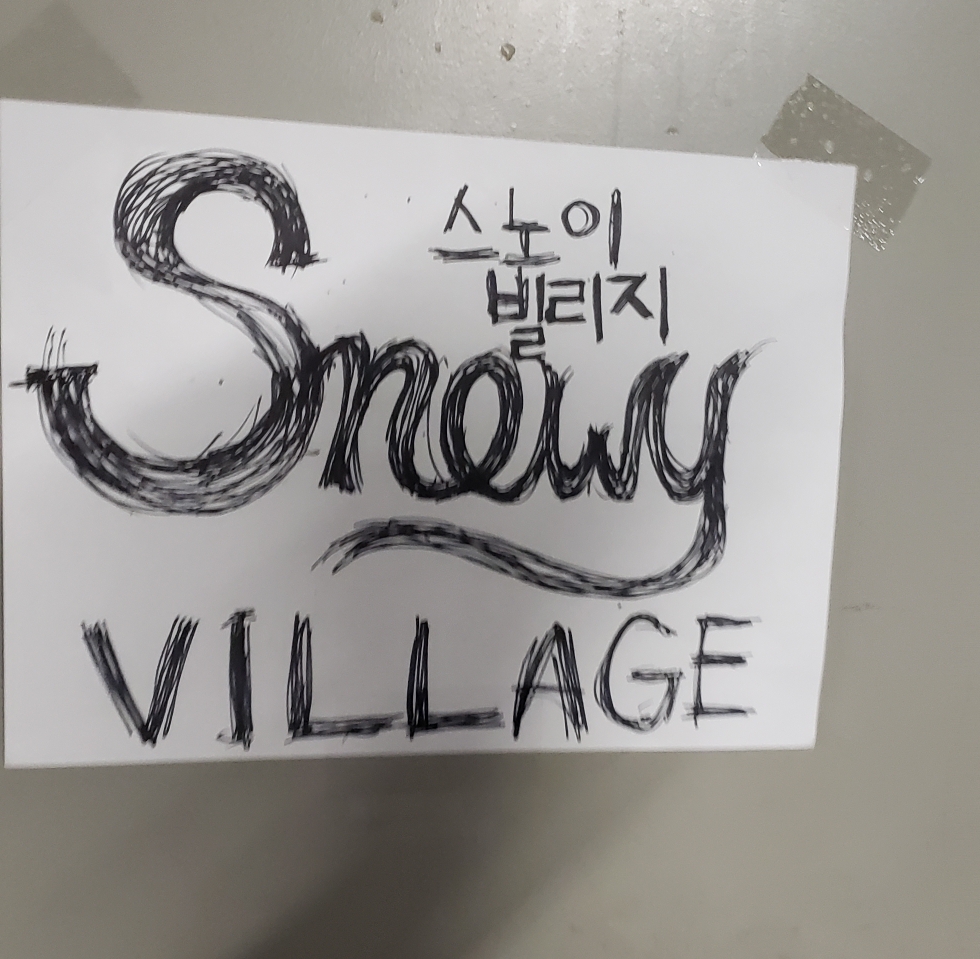 코퀴틀람 지점에는 작은 주차장이 있어서 편리한데요, 주차장에서 가게로 들어가는 문에 이렇게 손글씨로 스노이 빌리지라고 써있었어요.