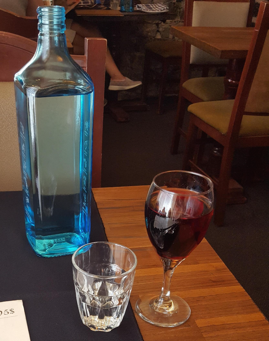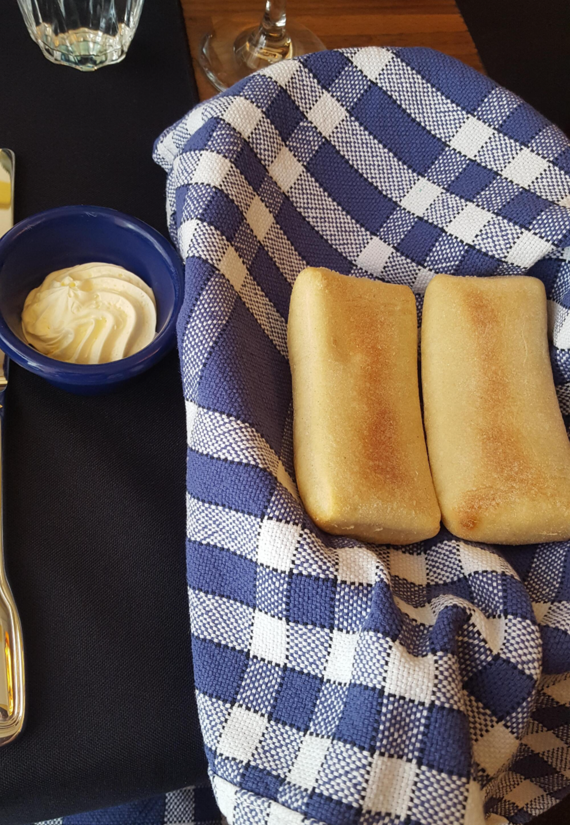 하우스 와인 주문 후 음식을 기다리는 중! 창가라서 밝고 분위기도 좋았다. 파란 냅킨도 소박한 느낌.