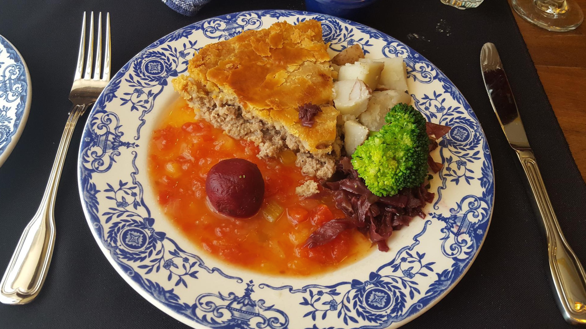 나는 한국에서 고기 파이를 먹어본 경험이 있긴 했지만 이렇게 요리로 나오는 것은 처음 먹어봤는데 고기가 들어있어서 파이가 부드럽고 아래 같이 나오는 소스와도 잘 어울려서 색다른 맛을 느낄 수 있었다.