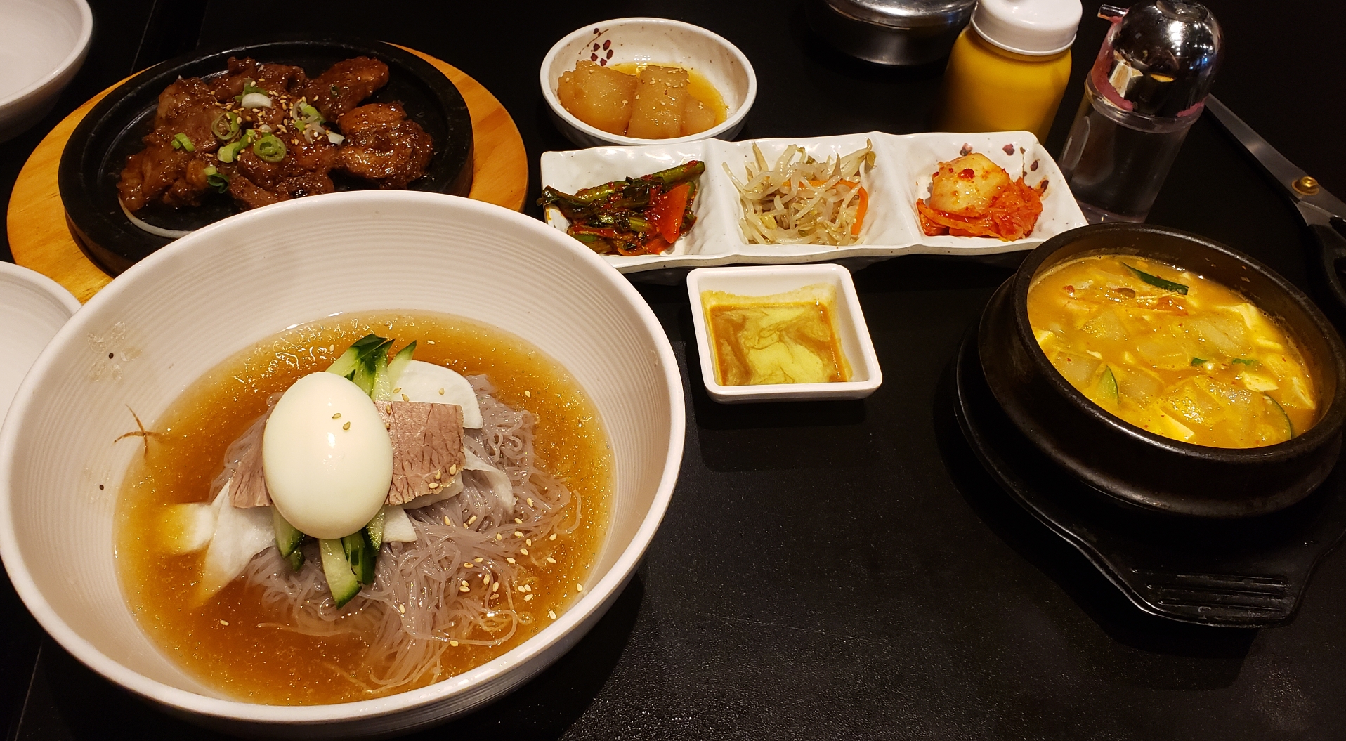 이 세트는 돼지갈비/불고기/매운돼지불고기 중 1가지와, 순두부/된장찌개/물냉면/비빔냉면 중 1가지가 같이 나오는 스페셜 메뉴인데 그냥 제가 임의로 고쌈냉면처럼 돼지갈비+물냉면으로 주문한겁니다ㅎㅎ