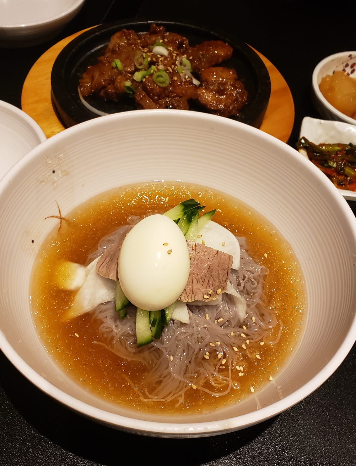 메뉴는 다양하게 있는데요, 저는 한국에서 고쌈냉면을 엄청 좋아했었거든요. 그게 생각나서 돼지 갈비+물냉면 세트를 주문했어요.