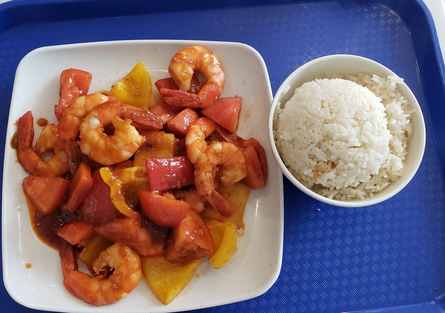 마지막으로, 뇨냐 삼발 프라운인데요. 파프리카랑 토마토와 왕새우들이 삼발 소스에 볶아져서 나와요. 소스는 약간 해산물 맛이 있습니다. 새우가 통통하고 간도 적당히 짭짤해서 맛있게 먹긴 했는데요. 비린내에 아주 예민하시다면 (소스 때문에) 추천하진 않습니다.