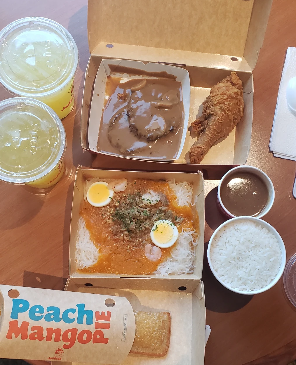 저는 Palabok Fiesta w/ soda로 팔라복 피에스타와 파인애플 쥬스를, 1pc Jolly Crispy Chicken w/ 2pc Burger Steak & Soda with 1side로 치킨1조각, 버거스테이크2개, 파인애플 쥬스, 밥을, 그리고 유명한 피치 망고 파이를 주문했습니다. 이렇게 주문하니까 $25 정도 나오더라고요.