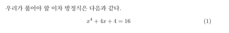 주의: equation을 쓰시려면 \begin{document} 전에 amsmath라는 패키지를 다음과 같이 써서 추가하셔야 합니다.\documentclass{article} \usepackage{kotex} \usepackage{amsmath} \begin{document} 우리가 풀어야 할 이차 방정식은 다음과 같다. \begin{equation} x^4+4x+4=16 \end{equation} \end{document}그러면 이렇게 출력됩니다.