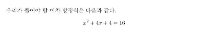 주의: equation을 쓰시려면 \begin{document} 전에 amsmath라는 패키지를 다음과 같이 써서 추가하셔야 합니다.\documentclass{article} \usepackage{kotex} \usepackage{amsmath} \begin{document} 우리가 풀어야 할 이차 방정식은 다음과 같다. \begin{equation} x^4+4x+4=16 \end{equation} \end{document}그러면 이렇게 출력됩니다.