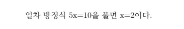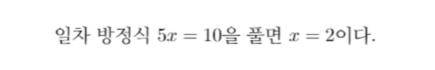 \documentclass{article} \usepackage{kotex} \begin{document} 일차 방정식 $5x=10$을 풀면 $x=2$이다. \end{document}이렇게요. 그러면 이렇게 예쁘게 줄력이 됩니다.