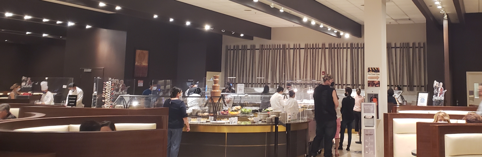 뷔페에 들어가면 이런 모습입니다. 왼쪽에는 군함초밥을 만드는 분들이 계시고 중앙에는 초콜릿 퐁듀 분수가, 그 뒤에는 스시, 사시미, 샐러드, 고기메뉴 등이 있습니다. 원래는 각자 먹을만큼 덜어가는 방식이었는데 코로나 이후로 직원들이 손님들이 달라는 메뉴를 집어주게 되었네요. 조금 불편하긴 합니다만 위생적으로 훨씬 좋지요.
