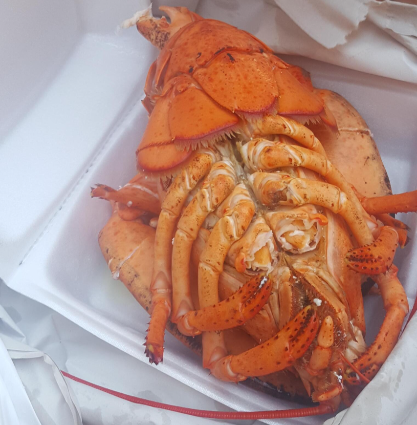 시세는 때마다 조금씩 다르다. 사진에 있는 랍스터는 두 마리에 4.75파운드라 당시에 $100 정도 냈던 것으로 기억한다. 조금 기다렸다가 찾으러 가면 이렇게 바로 찐 따끈한 랍스터를 받을 수 있다.