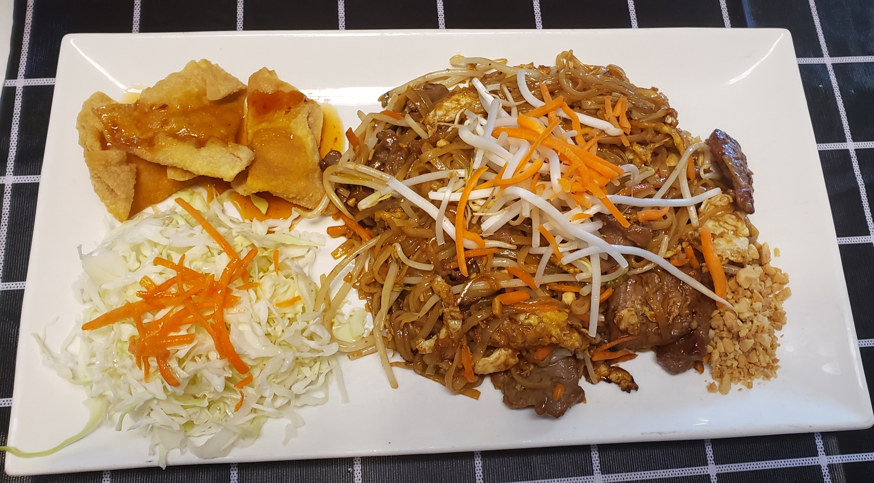 저는 소고기 팟타이와 닭고기 레드커리, 그리고 타이 아이스티를 주문했습니다.