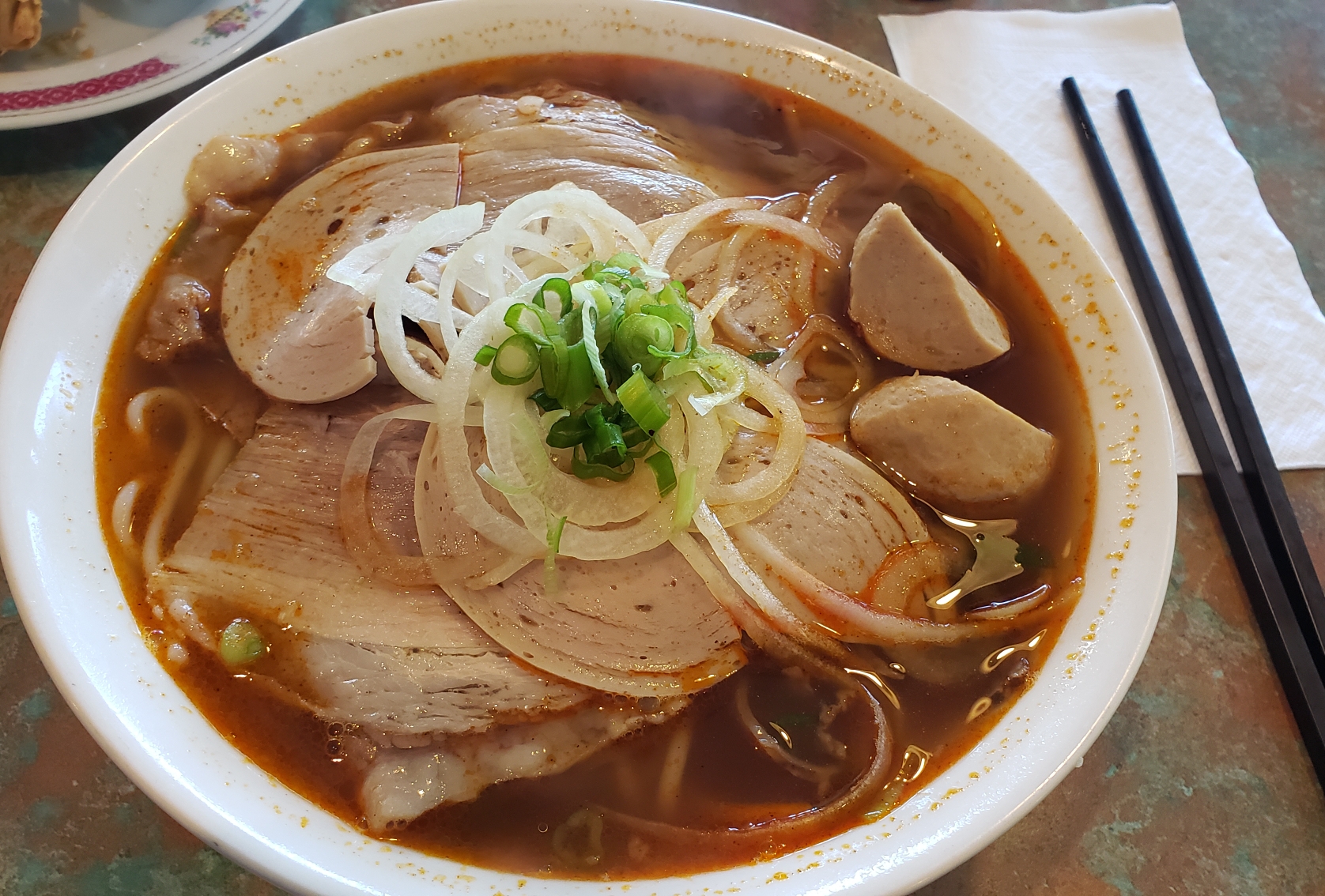 Bun bo Hue 국물이 진하고 약간 칼칼한 국수입니다. 분 보 후에Bun bo Hue는 베트남 후에 지방의 국수인데 흔히 드시는 쌀국수 포Pho와는 다르게 타피오카가 섞인 둥근 면을 사용하는 것이 보통입니다. 포보다는 면이 약간 쫄깃하고 단단합니다.